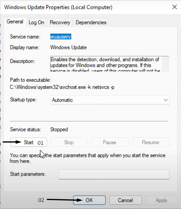 - Haga clic en "Comenzar"De la sección de estado del servicio, y luego espere hasta que se ejecute el programa y luego presione "DE ACUERDO”.