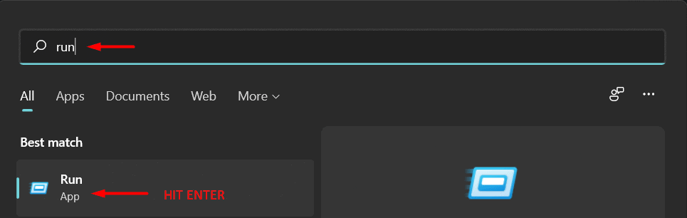 - Tipo "Correr”luego presione el botón “Ingresar"Tecla para abrir el"Correr" solicitud.