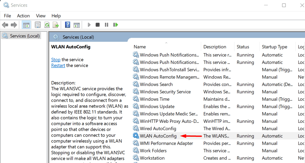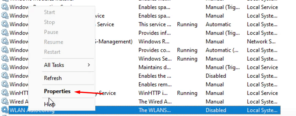 - Haga clic derecho en "WLAN AutoConfig" con el mouse y luego seleccione "Propiedades".
