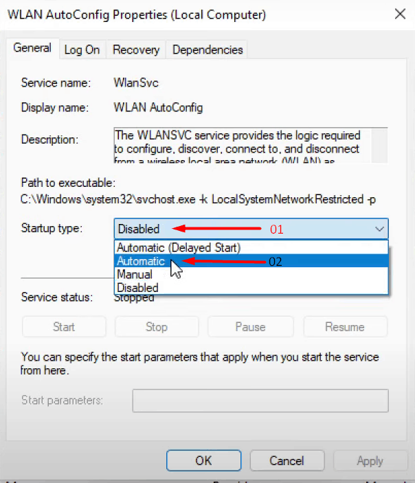 - cambiar el“Tipo de inicio”de discapacitado a “Automático”