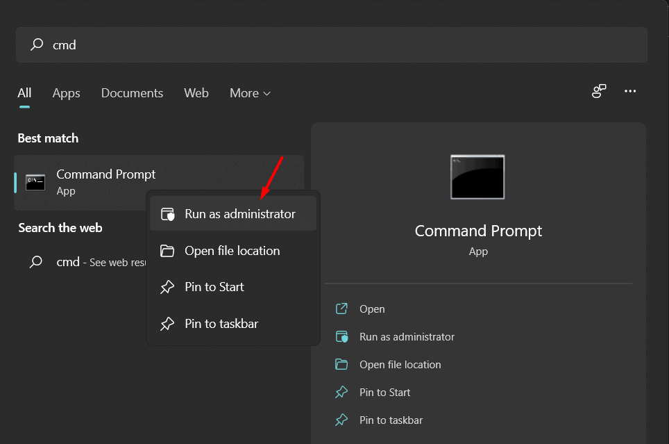 - Tipo "CMD”en la barra de búsqueda.“Símbolo del sistema”aparecerá en el “Mejor Partido”.