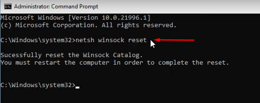 - Tipo "reinicio de netsh winsock”luego presione el botón “Ingresar" llave.