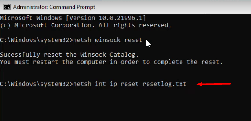- Tipo "netsh int ip restablecer resetlog.txt" luego presione "Ingresar”.