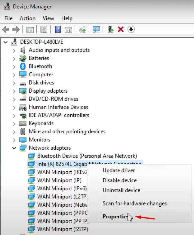 - Haga clic derecho en“Conexión de red Gigabit Intel® 82574L” usando el mouse, luego seleccione “Propiedades”.