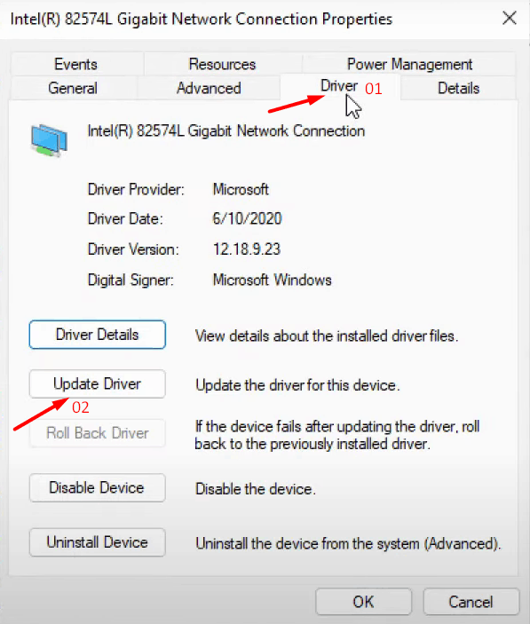 - Haga clic en el "Conductor”sección haga clic en“Actualizar controlador”.
