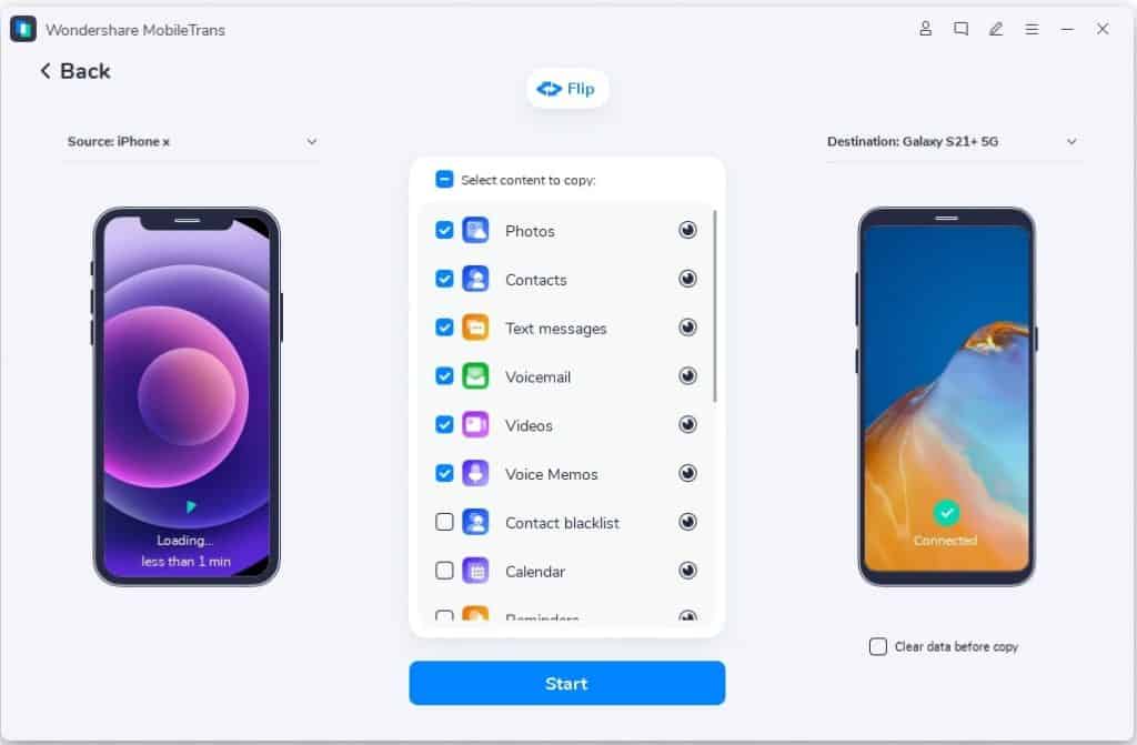 - Sin embargo, una vez que se reconozcan sus dispositivos, ajuste los lados de los teléfonos. Asegúrese de que el iPhone esté a la derecha y el teléfono Android, que es el teléfono emisor, esté a la izquierda. Puedes cambiar sus lados haciendo clic en "Voltear.”