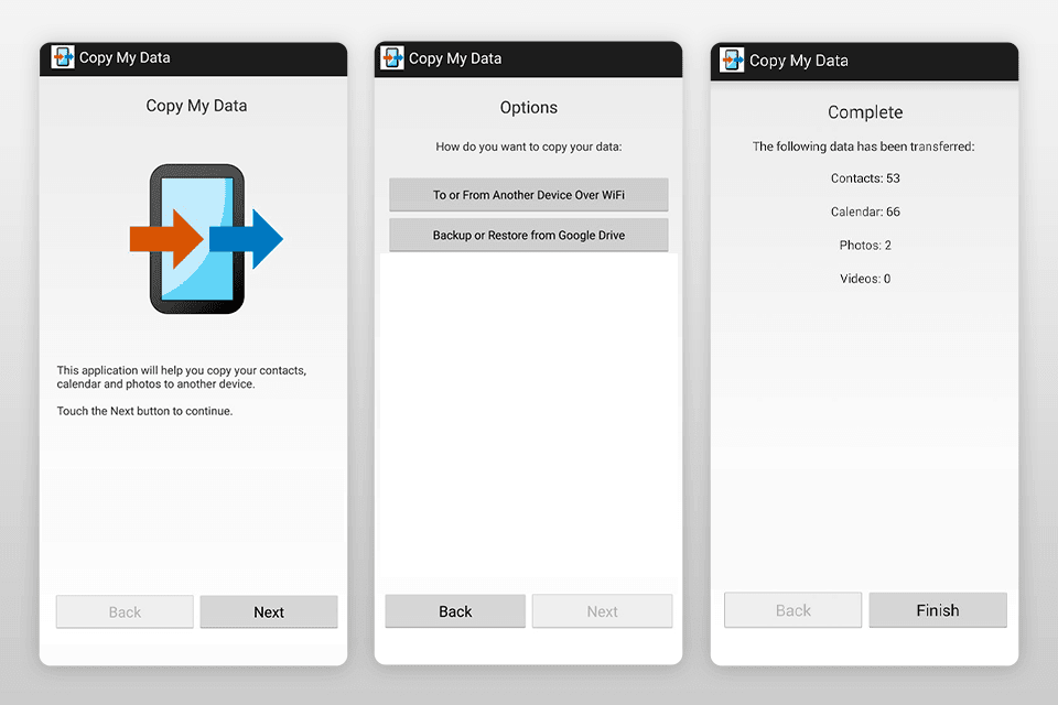 - Entre dispositivos Android: , SMS, registros de llamadas, música, vídeos, fotos, libros electrónicos y aplicaciones se comparten