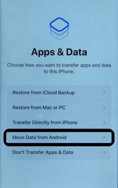 - Ir alPantalla de aplicaciones y datosy eligeMover datosdesde Android.
