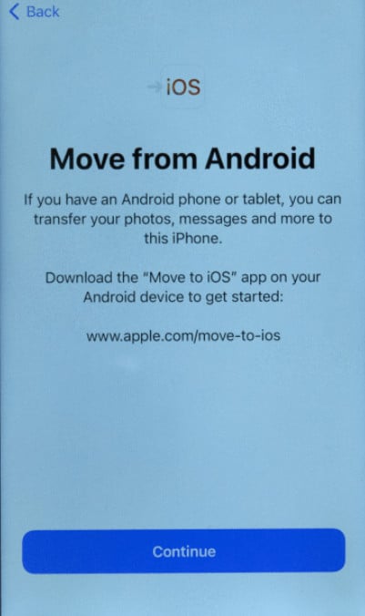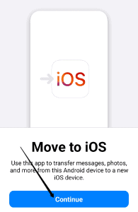 - En su dispositivo Android, abra la aplicación Mover a iOS y luego toqueContinuar.