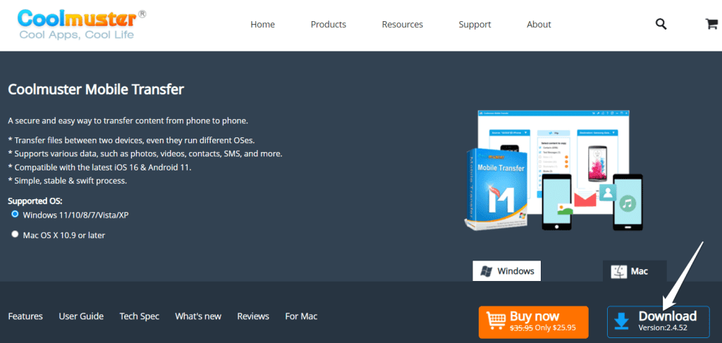 - Coolmuster Mobile Transfer permite la transferencia de archivos con un solo clic desde Android a iPhone, y actualmente admite contactos y libros electrónicos.