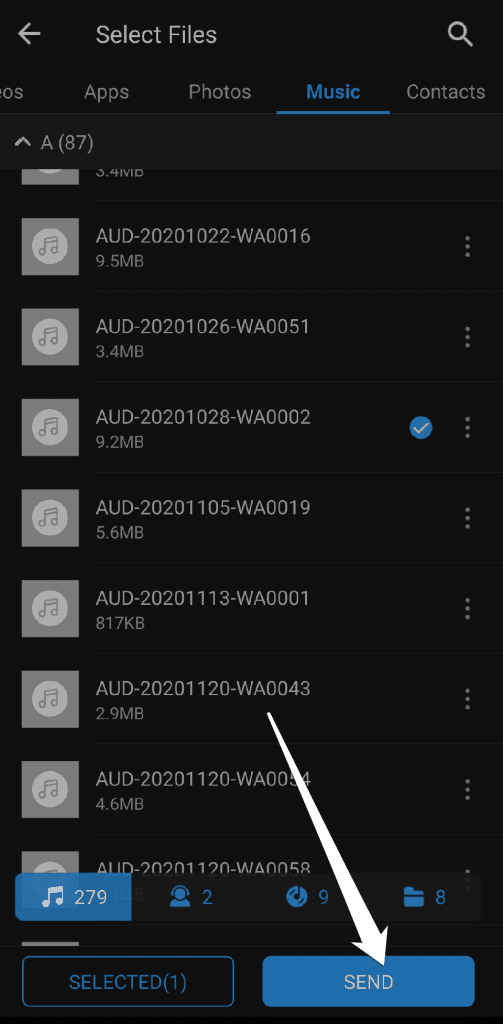 Luego, seleccione los archivos que desea enviar desde su dispositivo Android a su iPhone y luego toque elEnviaropción.