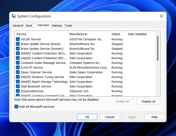 - En elServiciospestaña, haga clic enOcultar todos los servicios de Microsofty haga clic enDesactivar todo.