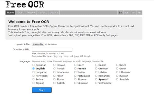 Si está buscando una herramienta gratuita para extraer textos de imágenes, Free OCR es la indicada para usted. Admite conversión de varios idiomas. El límite de tamaño máximo es 7 MB, lo cual es suficiente porque solo convierte la primera página, lo cual es un inconveniente de esta herramienta. Aún así, vale la pena usarlo porque no necesita ningún registro para convertir su archivo. Con su simplicidad, le encantará utilizar esta herramienta.