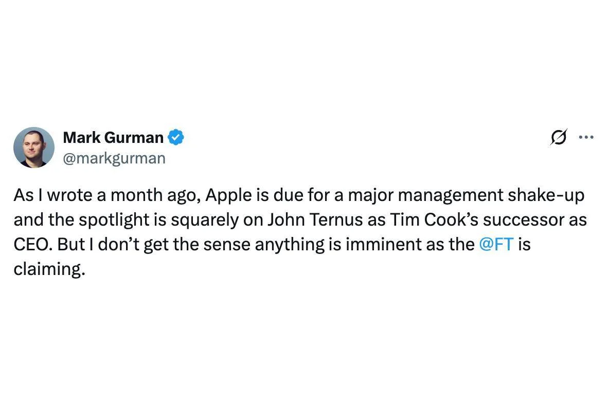 Puede que todavía no esté preparado para ser el centro de atención, yBloombergperiodista Mark Gurmandiceuna reorganización no es inminente. En cualquier caso, es probable que Cook siga siendo presidente de la junta directiva después de su retiro, por lo que Ternus no estará solo.