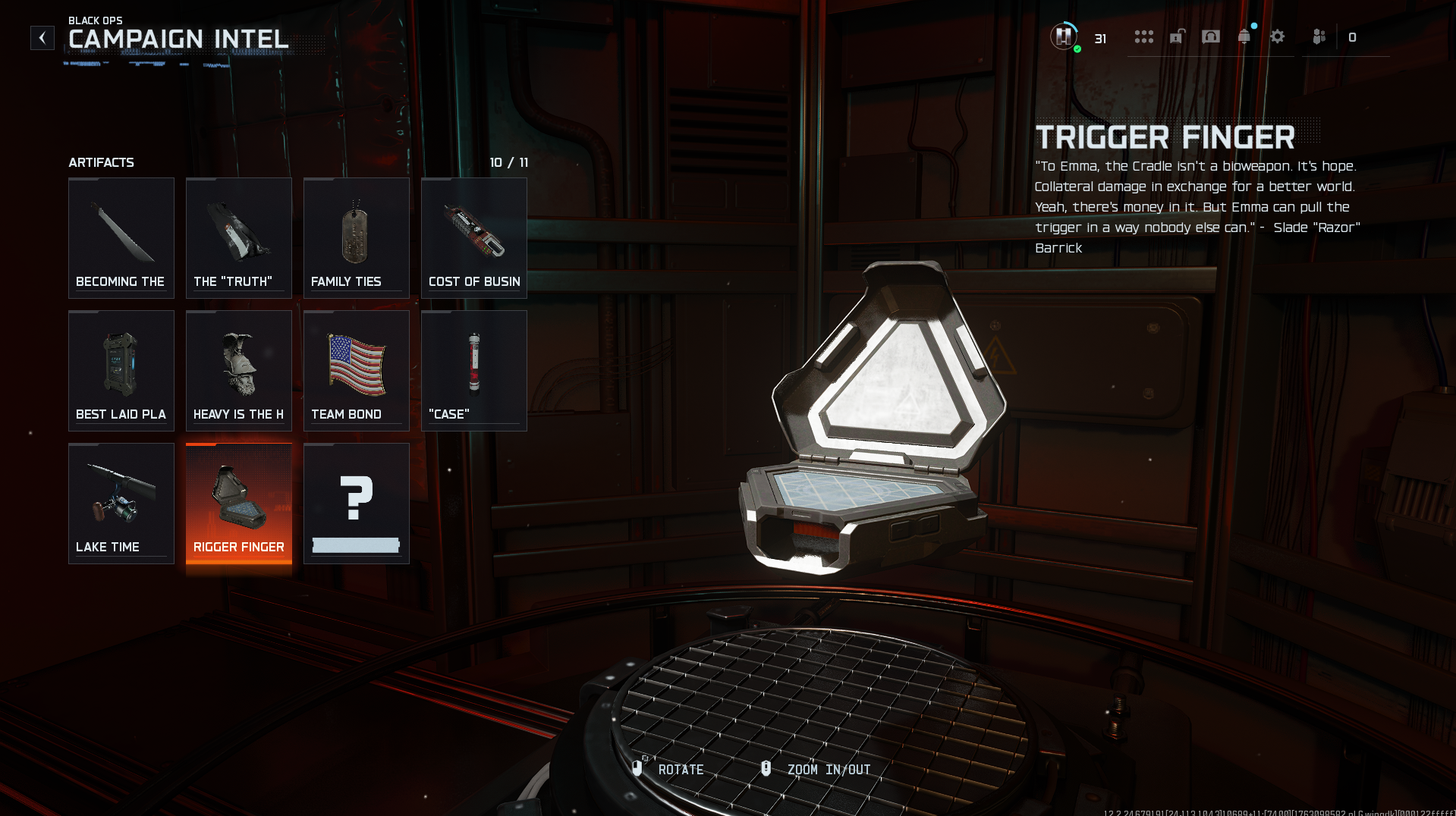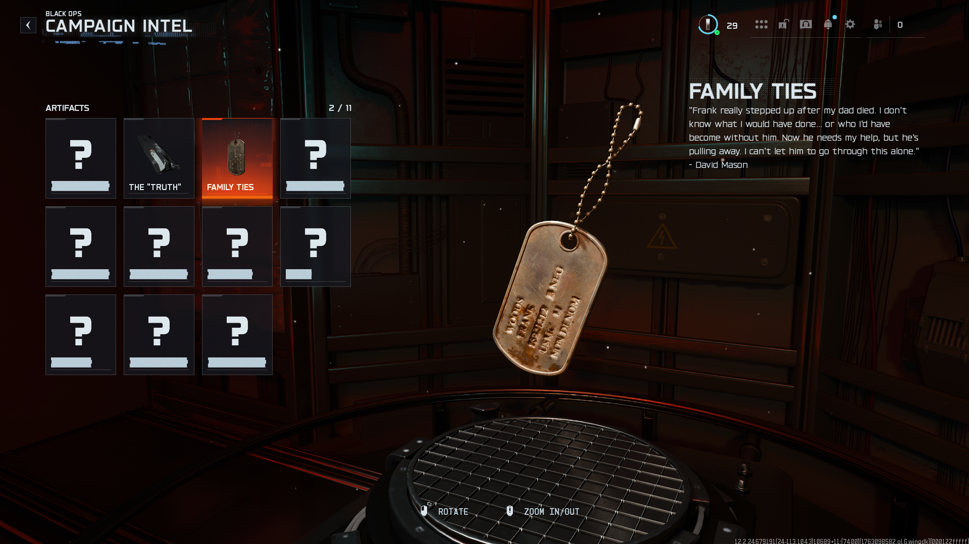 En la misión Distorsión, cuando llegues al contenedor para rescatar a Woods, no lo abras todavía. Usa tu gancho para alcanzar la plataforma flotante detrás de ella, luego date la vuelta para ver una pequeña habitación dentro de una roca flotante: la información de "Family Ties" está colgada en la pared interior.