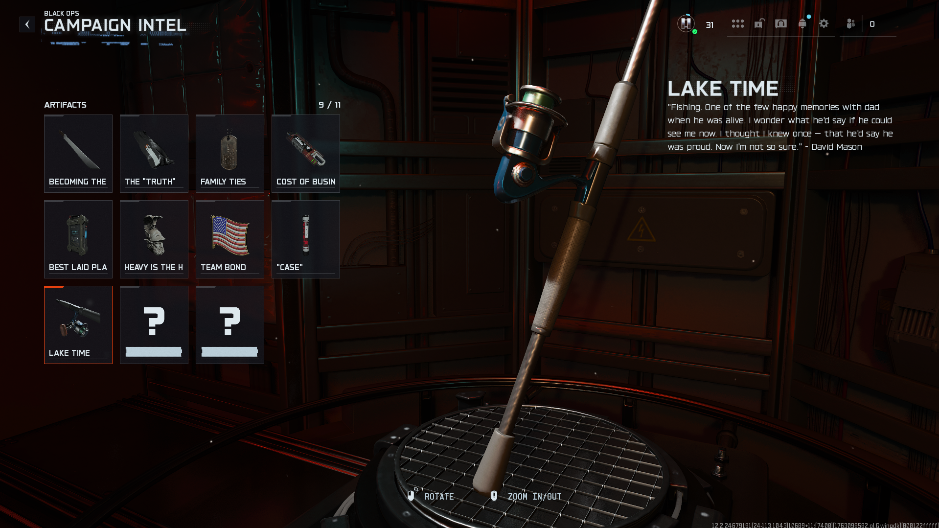 Dentro de la cabaña de caza de Mason, sube a la primera habitación a la derecha. Mire hacia la esquina al lado de una cómoda de madera para encontrar una caña de pescar etiquetada con el nombre de esta información.