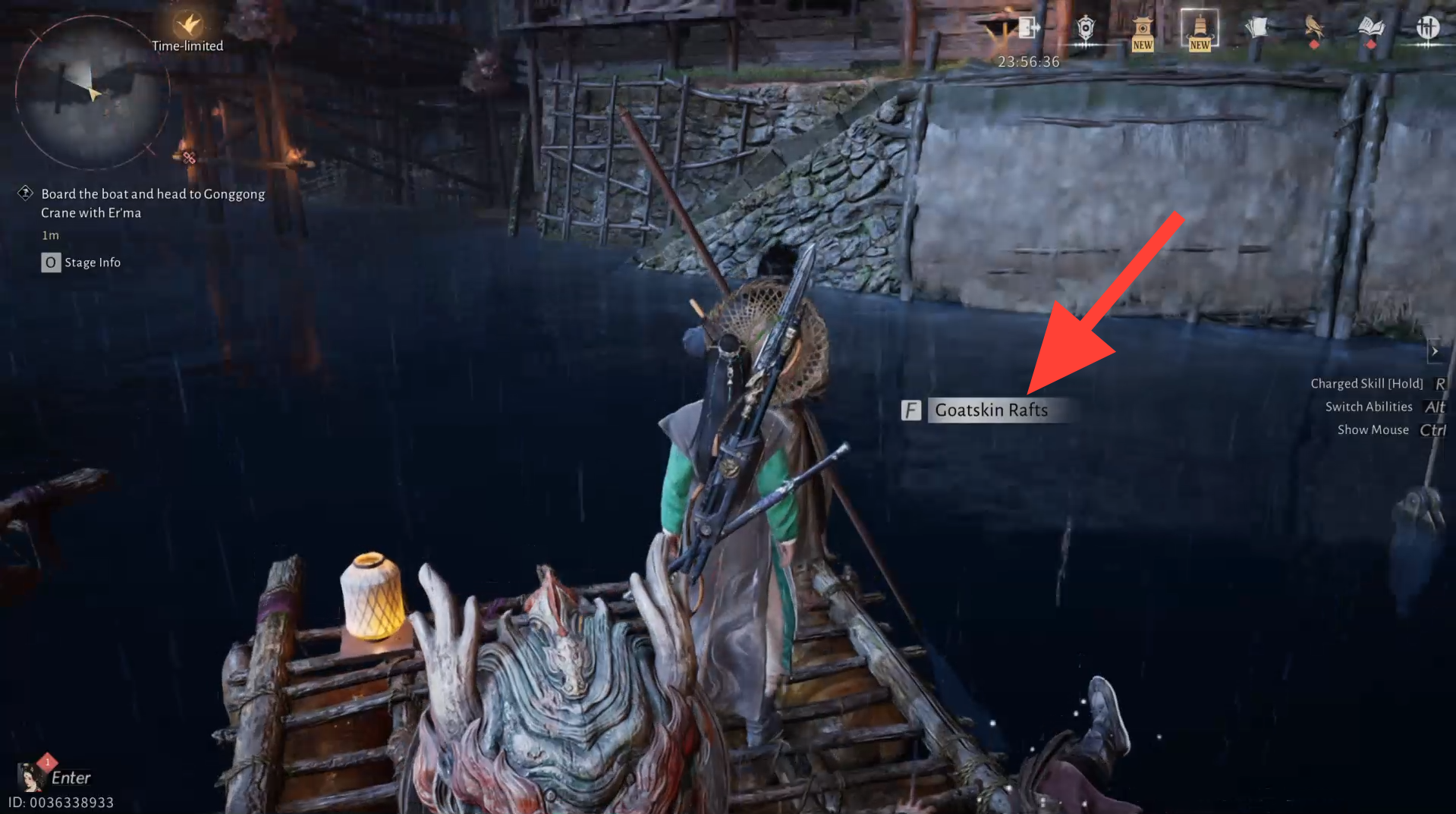 Después de colocar el cebo, sube a la balsa con Er Ma e interactúa con la “Balsa de pieles de cabra” para avanzar.