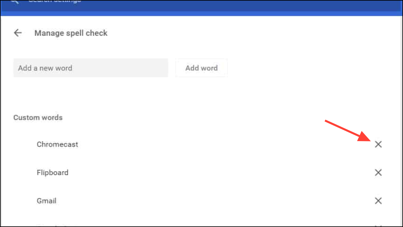 Paso 2:Para eliminar una palabra, ubíquela en la lista y haga clic en elincógnitaal lado de esa entrada. Esto elimina instantáneamente la palabra de su diccionario personalizado, por lo que Chrome la marcará una vez más como un error tipográfico si está mal escrita en futuros escritos.
