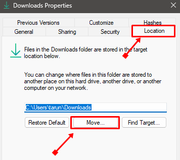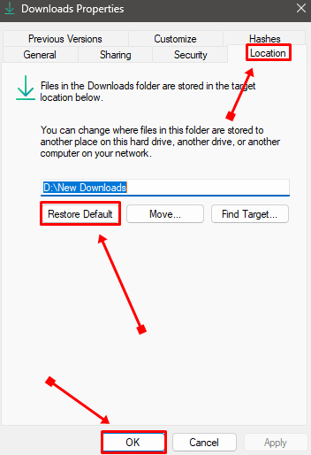 6. Para restablecer la carpeta de Descargas a su ubicación anterior, simplemente vaya aPropiedades de descargasy luego tocaUbicacióny haga clicRestaurar valores predeterminados. Le pedirá que transfiera archivos nuevamente. Seleccione en consecuencia y luego presioneDE ACUERDO.
