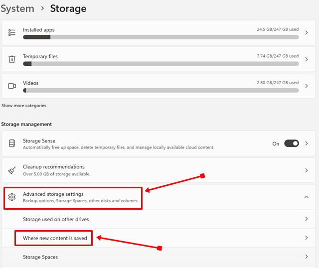 3. Desplácese hacia abajo y luego haga clic enConfiguración de almacenamiento avanzada > Dónde se guarda el contenido nuevo.