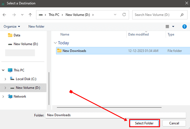 3. Vaya a la unidad donde desea mover la carpeta de descarga predeterminada, luego haga clic enSeleccionar carpetabotón. También puedes elegir cualquier otra ubicación que prefieras.