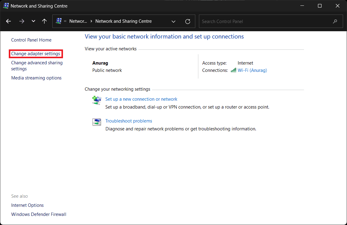 - En la barra lateral izquierda, haga clic en elCambiar la configuración del adaptadoropción.