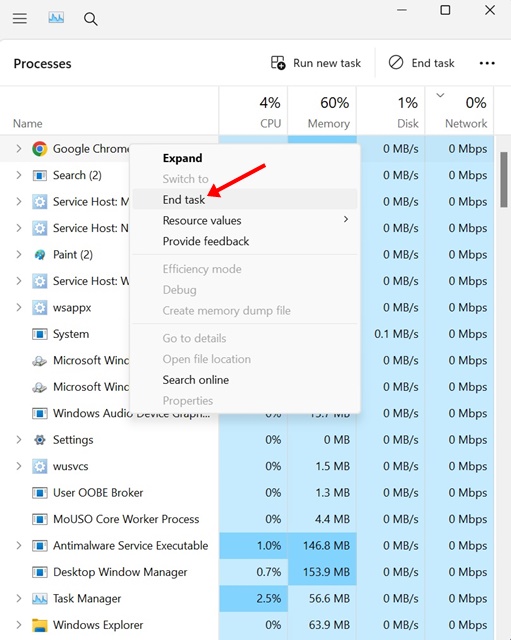 4. Si no desea que una aplicación específica se conecte a Internet, haga clic derecho en el nombre de la aplicación y seleccioneFinalizar tarea.