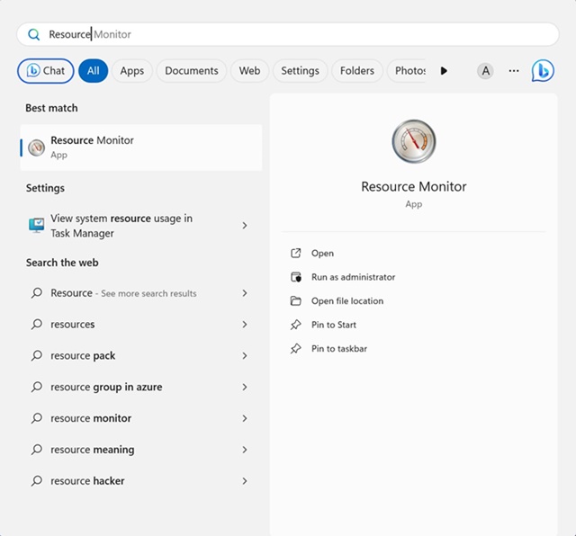 1. Abra la aplicación Resource Monitor desde la búsqueda de Windows 11.