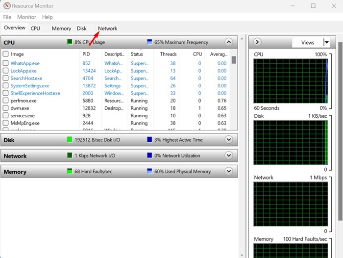 2. Verifique las aplicaciones que usan Internet usando el Monitor de recursos