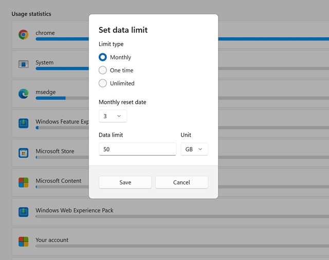 5. Configure el tipo de límite, restablecer datos y el límite de datos. Una vez hecho esto, haga clic enAhorrar.