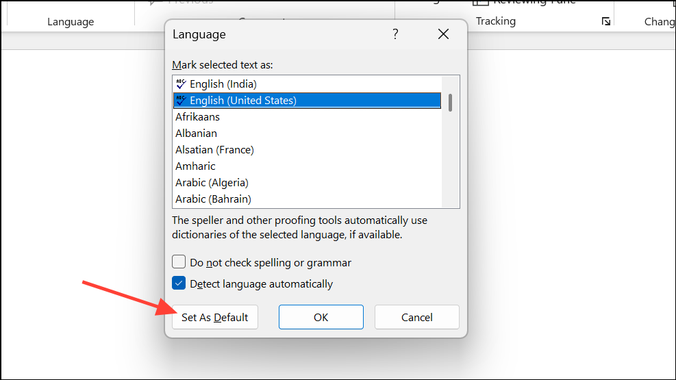 Paso 2:En el cuadro de diálogo, seleccione el idioma que desee (por ejemplo, “inglés (Reino Unido)” para las reglas ortográficas y gramaticales del Reino Unido) y haga clic enSet As Defaultsi desea que esto se aplique a todos los documentos futuros.