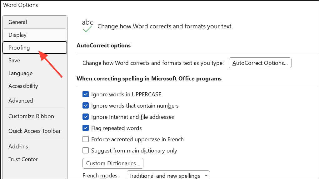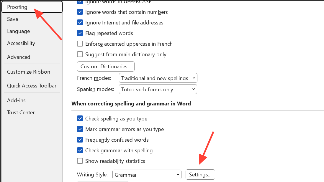 Paso 2:En la ventana Opciones de Word, elijaProofingdesde el menú de la izquierda. Desplácese hasta la sección denominada "Al corregir la ortografía y la gramática en Word". Aquí, haga clic enSettingsjunto a "Estilo de escritura".