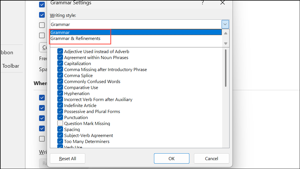 Paso 3:Aparece un nuevo cuadro de diálogo con una lista de reglas gramaticales y de estilo. Puedes cambiar elWriting Stylemenú desplegable entreGrammaryGrammar & Refinements. La última opción agrega controles de claridad, concisión, formalidad y más.