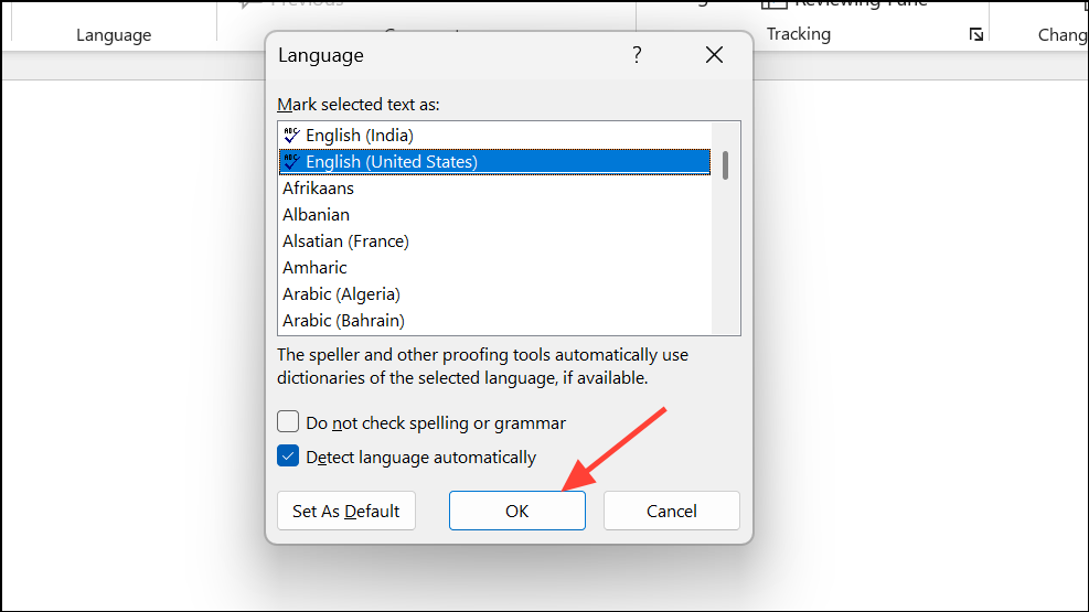 Paso 3:Hacer clicOKpara aplicar la configuración de idioma. El editor y las herramientas de revisión integradas ahora buscarán problemas de acuerdo con las convenciones del idioma seleccionado.
