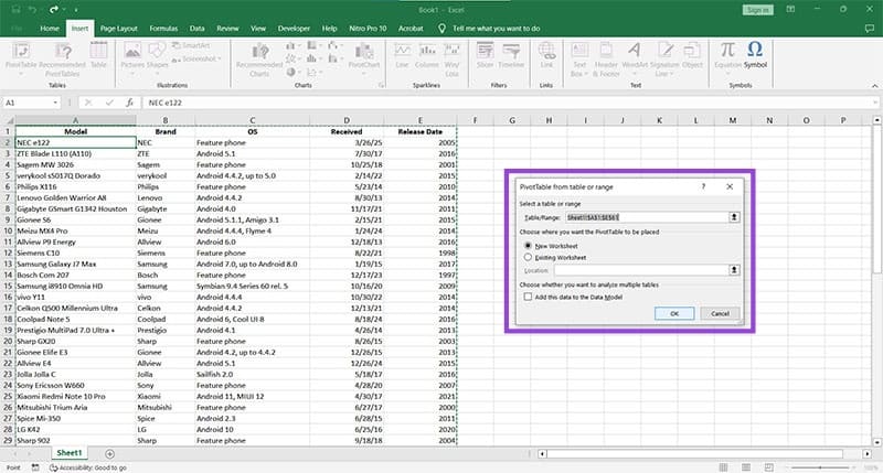 3. En la ventana que aparece, asegúrese de que toda la tabla de datos esté seleccionada. Esto incluye los títulos. También puede exportar esta nueva tabla dinámica a una nueva hoja de trabajo. Haga clic en "Aceptar" una vez hecho.