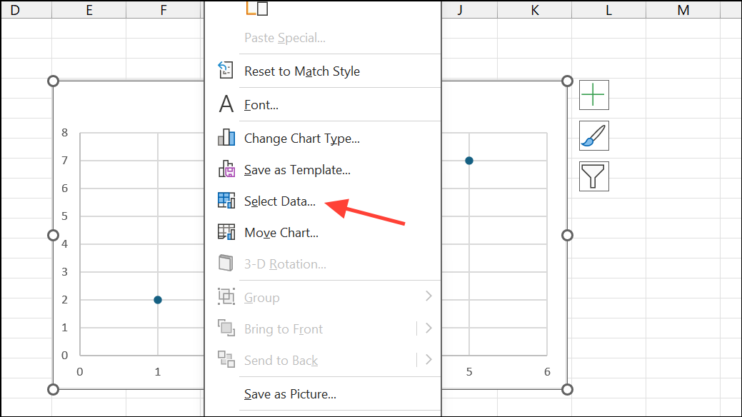 Paso 3:Haga clic derecho en el área del gráfico y seleccioneSelect Data. Añadir una nueva serie: paraSeries X values, seleccione su columna de fecha; paraSeries Y values, seleccione sus números de trazado.