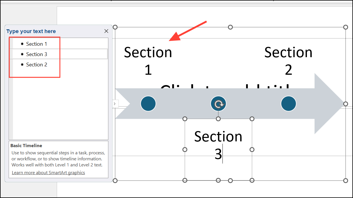 Paso 4:Introduce los datos de tu línea de tiempo. Puede escribir directamente en los cuadros de texto del marcador de posición en el gráfico, pero usando elText Pane(accesible a través de la pequeña flecha a la izquierda del SmartArt) permite una entrada más rápida y una adición más sencilla de nuevos hitos. PrensaEnterpara agregar más eventos y usarShift + Enterpara insertar un salto de línea dentro de un hito para separar fechas y descripciones.