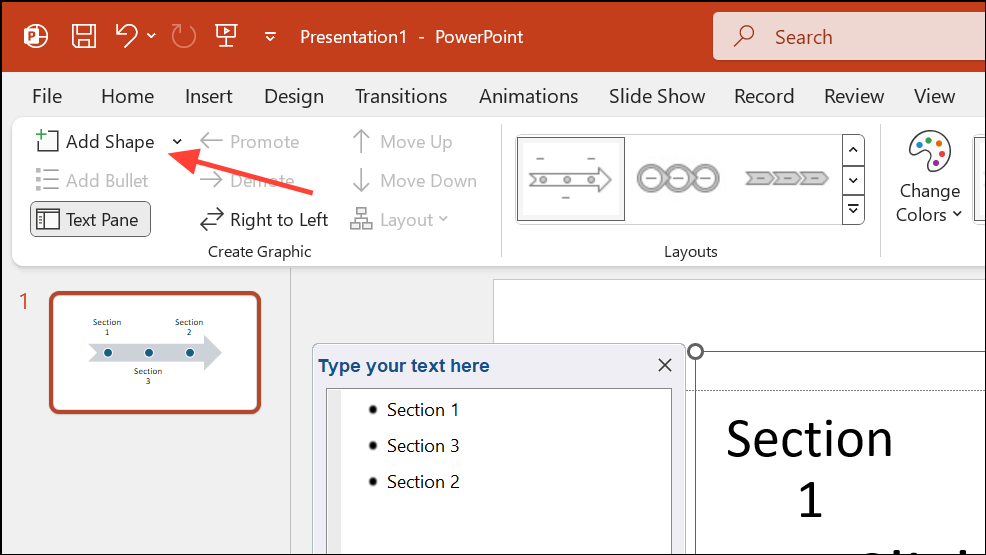 Paso 5:Para agregar más hitos, seleccione una forma en la línea de tiempo, luego use elAdd Shapeopción en la pestaña Diseño SmartArt. ElegirAdd Shape AfteroAdd Shape Beforepara controlar la colocación de nuevos elementos.