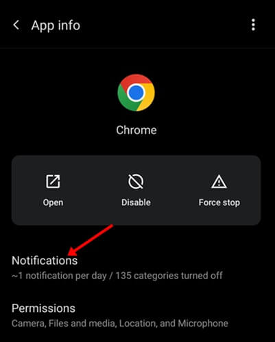 Para deshabilitar las notificaciones de Chrome, abra elInformación de la aplicaciónpágina de Chrome. Aquí, tocaNotificacionesy apague la palanca correspondiente. Esto desactivará las notificaciones de Chrome en su teléfono Android. Puede seguir los pasos anteriores para detener las notificaciones de Chrome en su teléfono Android.