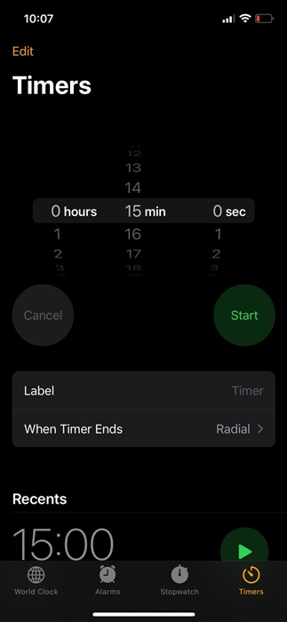 5. Para probar si la función está activada correctamente, abra elAplicación de relojen tu iPhone yiniciar un temporizador.