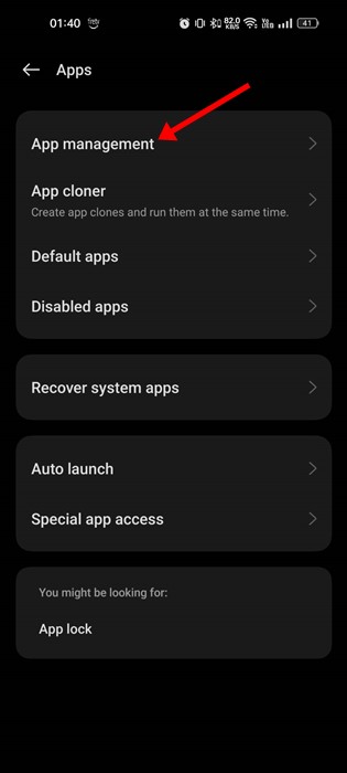 1. AbiertoAjustes,seleccionarAplicaciones > Aplicaciones instaladas.