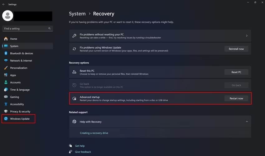 Paso 1: Haga clic en el menú Inicio, luego seleccione el ícono de ajustes para abrir Configuración. Vaya a Windows Update > Recuperación, luego haga clic en Reiniciar ahora en la sección Inicio avanzado.