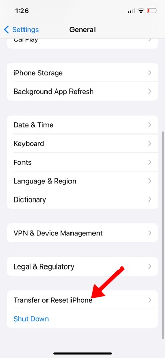 3. Desplácese hasta el final y toqueTransferir o restablecer iPhone.