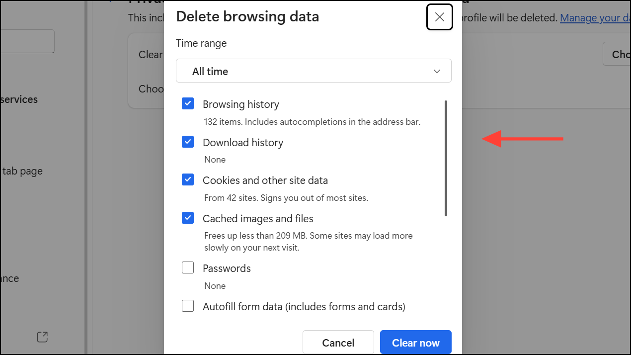 Paso 2:Establecer elRango de tiempoaTodo el tiempo. ControlarCookies y otros datos del sitioyImágenes y archivos almacenados en caché.
