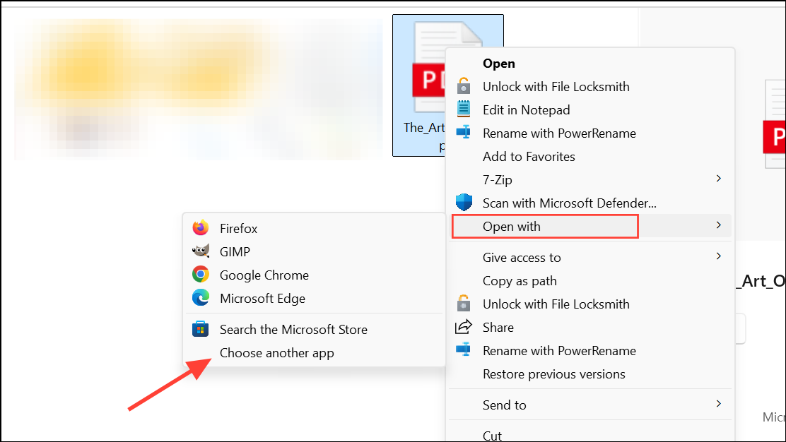 Paso 1:Localice el archivo PDF en su dispositivo y haga clic derecho en él. ElegirOpen withy seleccione un lector de PDF alternativo (como Adobe Acrobat Reader) u otro navegador web como Chrome o Firefox.