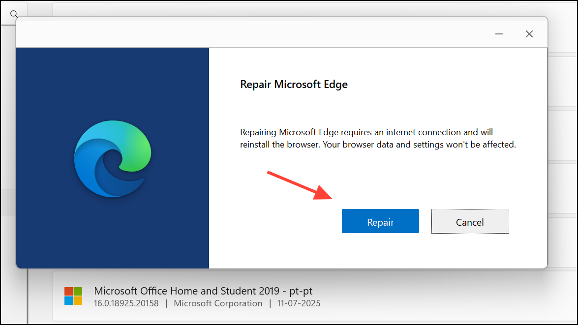 Paso 4:En la ventana emergente, seleccioneRepair. Windows reinstalará Edge sin afectar sus datos ni su configuración.