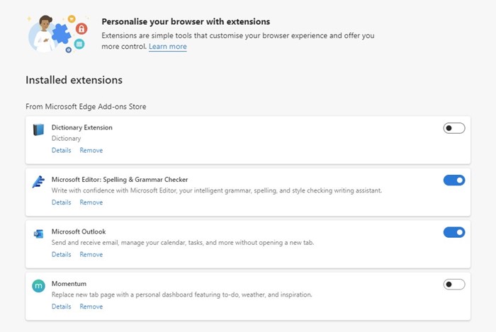 3. Deshabilite todas las extensiones activas. Una vez deshabilitado, reinicie el navegador Edge.