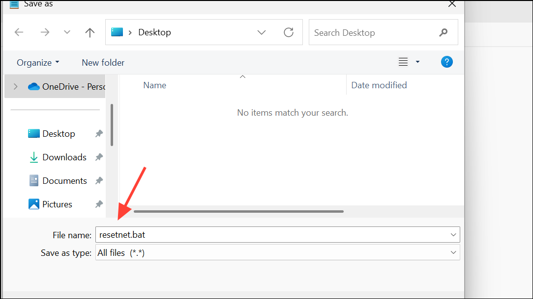 Paso 2:Guarde el archivo comoresetnet.baten tu escritorio.