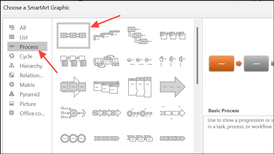 Paso 2:En el panel izquierdo del cuadro de diálogo, elija elProcesscategoría. Explore los diseños disponibles y haga clic en cualquiera para obtener una vista previa de su nombre y descripción. Las opciones comunes incluyen “Proceso básico” o “Proceso de acento de imagen” si desea incluir imágenes. Hacer clicOKdespués de seleccionar su diseño preferido.