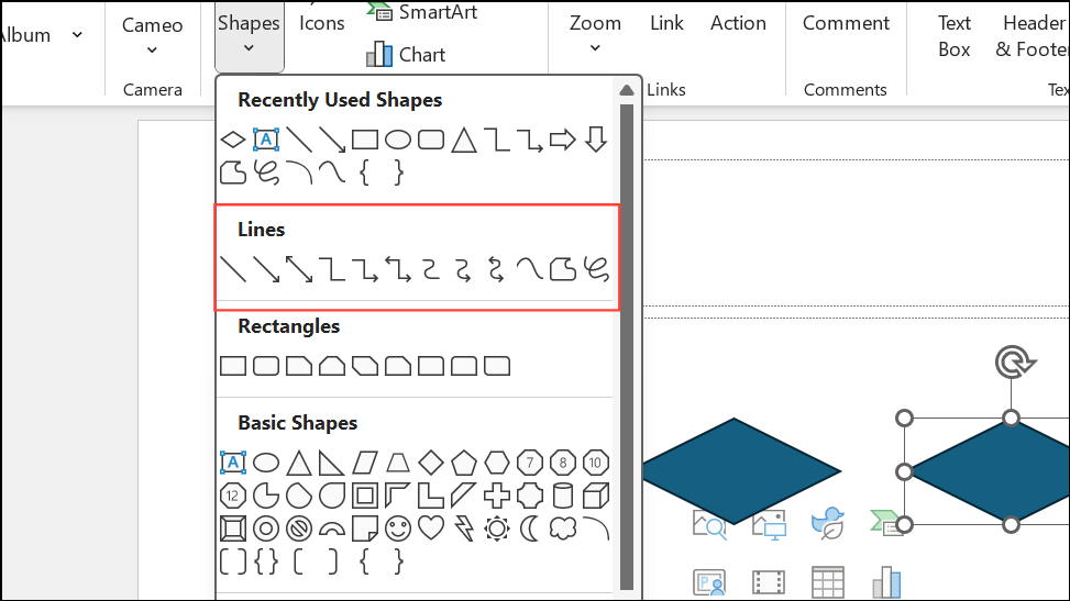 Paso 3:Para conectar formas y definir el flujo, regrese aInsert > Shapesy seleccione una flecha o conector de la sección “Líneas”. Dibuja líneas entre formas haciendo clic y arrastrando desde el borde de una forma a otro. Utilice puntos de anclaje para una alineación precisa.
